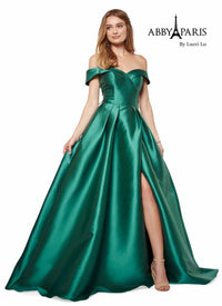 Abby Paris 90023 Mikado Off Shoulder A-Line Slit Gown is available at Formal Dress Shops in the following colors: