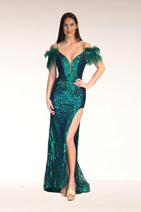Abby Paris 90271 Sequin Feather Cold Shoulder Slit Gown Sale price$601.00