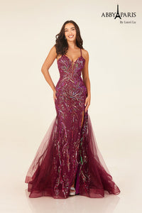 Abby Paris 90332 Beaded Sleeveless Slit Evening Gown by Abby Paris features glitter tulle, embroidery, sequins, and beaded embellishments over a fully lined polyester base, designed for comfortable movement and a body-skimming fit. Available in sizes 0, 2, 4, 6, 8, 10, 12, 14, 16.