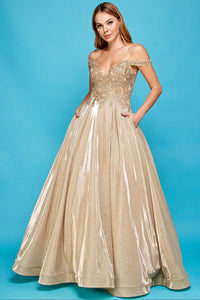 Adora Design 3007 Off Shoulder Glitter Metallic A Line Prom Dress is available at Formal Dress Shops in the following colors: