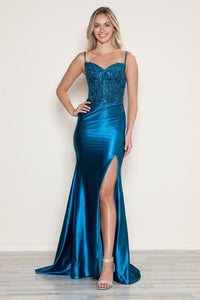 Poly USA 9710 Applique Satin Sleeveless Slit Gown