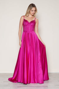 Shop for the perfect evening look with FormalDressShops' Poly USA 9610 Dress, a beaded satin long sleeveless corset dress with an A-line skirt that's sure to turn heads. With its sleeveless illusion sweetheart bodice and open back with zipper closure, this floor-length gown is perfect for prom, red carpet, gala, wedding guest, debutante ball, military and marine ball, evening wear, formal gown, or pageant.