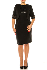 Beautiful floral sequined embroidery adorns the front of this sleeveless, boat neckline, knee-length sheath dress that matches the 3/4 mesh sleeves of the collarless, open-front, cropped jacket.