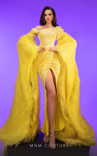 Make a statement with the Fouad Sarkis F02816 Couture Feathered Evening Gown, an eye-catching yellow masterpiece designed by MNM Couture. This long, flowing dress commands attention with its ruched silhouette, dramatic feathered cape, and daring slit. Whether it's a prom, gala, or a high-profile event, this piece radiates elegance and confidence. The off-shoulder neckline pairs beautifully with intricate embellishments, creating a look that's both sophisticated and daring. It’s crafted from luxurious materials that speak to quality, offering a sense of opulence and comfort. The vibrant yellow color makes it stand out in any setting, while the structural details emphasize a tailored fit, flattering your figure effortlessly. In its essence, this gown isn’t just clothing — it’s a statement of bold femininity and style prowess. Worn with statement heels and minimal jewelry, it transforms an ordinary evening into a memorable fashion moment. The feathered cape is detachable, adding versatility for different looks, while the high slit lends a flirtatious edge. Designed with the modern woman in mind, this evening dress combines classic couture elements with contemporary flair. It’s ideal for those who seek to make an unforgettable impression while feeling comfortable in a meticulously designed piece. Suitable for a variety of formal occasions, this gown offers a perfect blend of elegance and edge, tailored for standout women who aren’t afraid to be seen. Its flowing fabric, striking details, and bold silhouette capture attention, ensuring all eyes are on you. To keep this dress looking its best, dry clean only, and store it in a cool, well-ventilated space with the feathered cape secured separately. When selecting your size, consider a slightly tailored fit — if you’re between sizes, sizing up can enhance comfort. This gown’s striking look pairs beautifully with updo hairstyles and bold makeup, making it a true showstopper. If you’re dreaming of a look that combines luxe with a touch of daring, this couture dress is your go-to choice. Trust me, it’ll make the moment unforgettable, whether you’re walking a red carpet or celebrating a once-in-a-lifetime event.