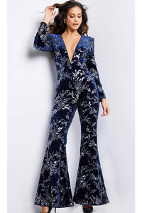 Jovani 23708 Navy Sequin Jumpsuit for Women Long Sleeve Velvet V-Neck