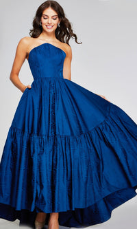 Make a stunning entrance in the Jovani 26152 strapless taffeta evening gown. This elegant high-low dress features a structured tiered A-line skirt with hidden pockets for both style and convenience. The lustrous taffeta fabric adds volume and movement, while the strapless neckline flatters the shoulders and collarbone. Ideal for prom, formal galas, or weddings, this sophisticated gown offers modern glamour with timeless appeal.