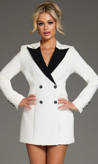 Looking for a dress that combines structured sophistication with a touch of floral flair? The Jovani 42124 is a tailored mini dress that effortlessly blends tuxedo-inspired details with feminine elegance. Made from crisp woven fabric, this short-length number features a sharp contrast collar, long sleeves, and a double-breasted style that’s both modern and striking. Decorative floral buttons add a playful yet refined detail, making it ideal for homecoming, parties, or any semi-formal event where you want to stand out.