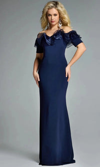 Off-Shoulder Navy Gown with Ruffle Detail by Jovani