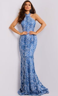 Looking to turn heads at your next formal event? The Jovani 43678 gown offers a bold mix of sparkle and sleek design. Made from shimmering sequin lace, this long sheath dress features a sleeveless cut and a high halter neckline that visually elongates the neck and frames the face beautifully. Meanwhile, the racerback detail adds an unexpected modern twist for a standout moment. The natural waistline flows into a dramatic skirt that flares softly at the sweep train, creating movement and grace with every step. Whether you're attending a prom, a fancy gala, or a special occasion, this dress combines elegance with contemporary edge.