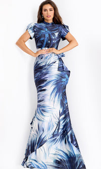 Jovani Leaf Print High Neck Evening Gown