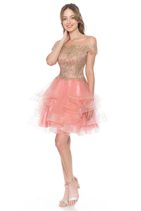 Off-Shoulder Tiered Tulle Short Party Dress with Gold Embroidered Bodice By Lenovia 8151