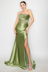 Experience the elegance of Poly USA 9688 Dress at FormalDressShops, where you can buy this stunning satin long strapless lace bodice dress with a fitted slit skirt online. With its strapless illusion sweetheart bodice featuring corset boning and an open lace-up back with zipper closure, this floor-length gown is perfect for prom, red carpet, gala, wedding guest, debutante ball, military and marine ball, evening wear, formal gown, or pageant.