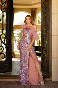 Sequin Feather Off Shoulder Slit Gown by Lucci Lu 1337