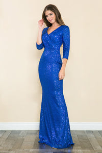 Sequin V-Neck Mermaid Evening Gown with 3/4 Sleeves Formal Dress By Lenovia 8186