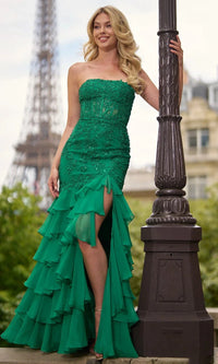The Sherri Hill design focuses on considered details and a refined silhouette, with a strapless sheer corset bodice and dramatic ruffled skirt. Layered craftsmanship and well-placed embellishments ensure a striking finish from every angle.