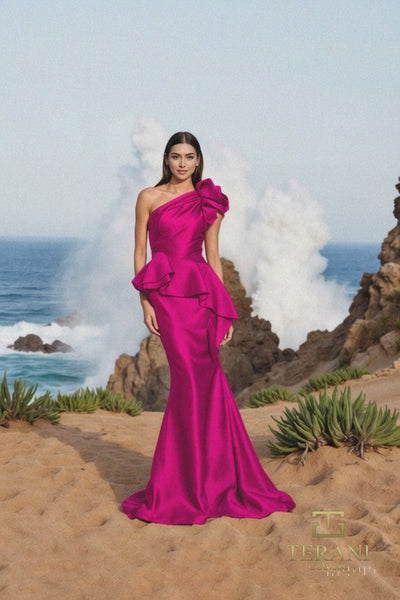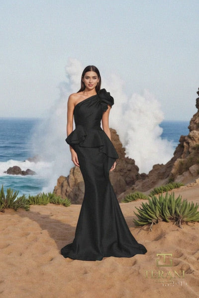 Turn heads in the Terani Couture 252E5546 One-Shoulder Evening Gown—a sleek and sophisticated choice for your next formal event. Crafted from luxurious taffeta, this full-length gown features a flattering fit-and-flare silhouette that enhances your shape and flows elegantly with every step. The asymmetric neckline adds modern allure, while a structured peplum at the waist delivers both style and a figure-enhancing finish. Refined and eye-catching, this gown is ideal for prom, homecoming, or any black-tie occasion.