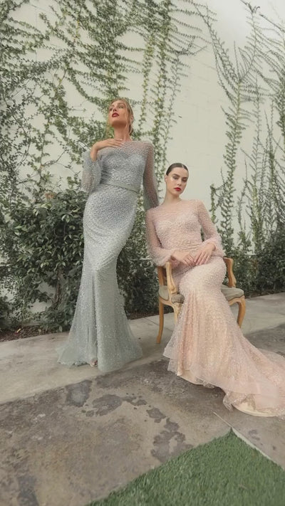 Exude elegant charm in the Andrea & Leo A0997 Iris Gown, a stunning long-sleeve dress adorned with delicate pearl beading. This fit-and-flare design features an illusion sweetheart bodice, gracefully complemented by sheer blouson sleeves. The enclosed sheer back is secured with a zipper closure, while the floor-length mermaid skirt flows beautifully with a sweep train and horsehair hemline for a sophisticated finish.