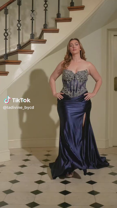 Enter your location at checkout to see available shipping methods and costs for Strapless Satin Corset Gown with Embellished Bodice & High Slit by Cinderella Divine CD736C in your area.