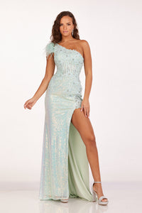 Abby Paris 90256 Feather One Shoulder Sequin Slit Gown