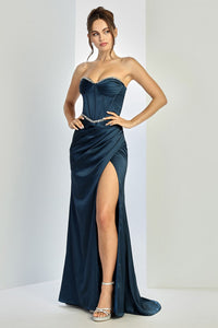 Adora Design 3243 Strapless Beaded Corset Pleated Slit Prom Gown is available at Formal Dress Shops in the following colors:
