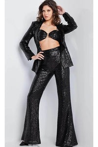 Make a stunning statement in the Black Jumpsuit Formal Outfit for Women by Jovani 26042, a sequin-embellished jacket pantsuit designed to captivate. This glamorous ensemble features a tailored jacket adorned with shimmering sequins, long sleeves for added sophistication, and a closed back for a polished finish. A light train adds graceful movement, while the sweetheart neckline and sleek pantsuit silhouette offer the perfect blend of elegance and comfort. Whether in Blush or Black, the Jovani 26042 promises a show-stopping entrance at any formal event.