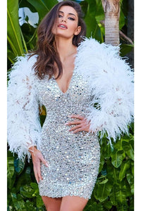 Adding a touch of drama and luxury, the long sleeves are adorned with lavish feather fringes, creating movement and texture that draw attention to your every gesture. The sheath skirt with a short hemline delivers a modern, playful edge while maintaining a polished, high-fashion aesthetic. Crafted from premium materials and meticulously embellished, the Jovani 08306 dress promises not only style but quality, making it a must-have for fashion-forward women who love to stand out.