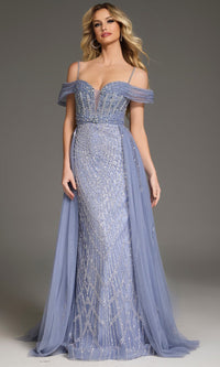 The Jovani 44845 gown is all about combining classic elegance with modern flair. Crafted from soft tulle, this dress features a shimmering beadwork bodice, a flowing A-line overskirt, and a flattering off-shoulder neckline. With spaghetti straps adding a touch of detail, it’s designed to turn heads at formal events or prom nights. The long silhouette and sweep train create a striking silhouette, perfect for making the moment unforgettable.