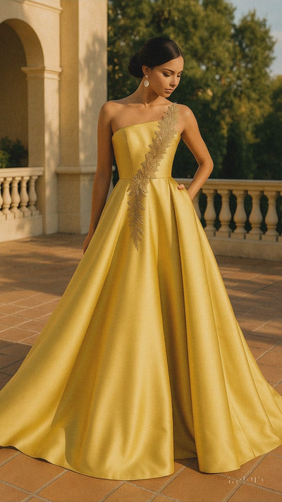 Turn heads in this stunning full-length gown, designed with an elegant one-shoulder neckline and a shimmering fern embellishment that gracefully sweeps across the bodice. The fitted top flows into a beautiful A-line silhouette, creating a timeless and flattering shape.