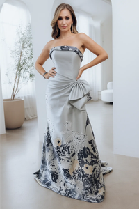 Turn heads in the Terani Couture 241E2494 Printed Long Formal Evening Dress—a stunning blend of timeless elegance and modern flair. Featuring a striking silver and black print, this strapless gown showcases a sleek silhouette that flatters every curve with expert tailoring. The full-length design enhances its sophisticated appeal, making it the perfect choice for galas, weddings, or formal soirées. Whether you're attending prom or seeking a plus-size formal option, this dress promises a show-stopping entrance.