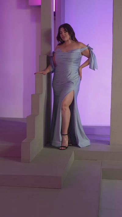 El vestido de noche para dama de honor Cinderella Divine CD943, talla grande, personifica la elegancia con su tejido de jersey elástico. El escote corazón y las mangas de hombros descubiertos complementan el corpiño ajustado y fruncido y la parte superior de la espalda, adornada con tirantes de lazo. La abertura alta, el dobladillo de crin y la cola le dan un toque de dramatismo, haciéndolo ideal para graduaciones, galas y eventos de etiqueta. El cierre de cremallera garantiza un ajuste seguro, mientras que su silueta entallada irradia sofisticación para la dama de honor o invitada.