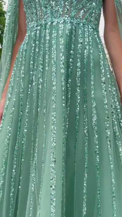 Haga una declaración con este vestido de manga larga tipo capa adornado con lentejuelas y cuentas y falda en forma de A de GLS Gloria GL3494.
