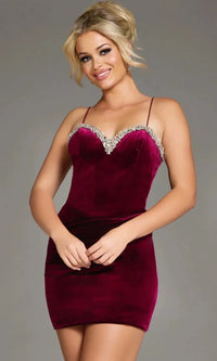 Step into your next event with a dress that blends rich texture and shimmering accents—meet the Jovani 40360 velvet dress. Crafted from sumptuous burgundy velvet, this fitted sheath highlights a sweetheart neckline, adorned with rhinestone trim for just the right amount of sparkle. The delicate spaghetti straps provide a flattering frame, while the ruched skirt adds visual interest and a sleek silhouette. Whether you're attending prom, a graduation, or an elegant party, this short dress offers versatile charm.