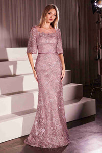 The Ladivine CB149 Dress from Cinderella Divine brings a blend of classic charm and modern sophistication. Crafted from glitter-embellished lace, this long sheath gown catches the light with its radiant glow, making it a standout choice for any evening occasion. A delicate illusion neckline complements the fit-and-flare silhouette, while charming half bell sleeves add a touch of softness and movement.