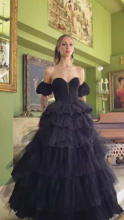 Reciba muchos elogios con este vestido largo sin tirantes, de manga abullonada y adornado con cuentas, con una falda con volantes en forma de A de GLS Gloria GL3626.