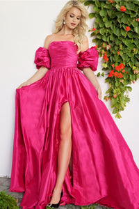 Luce como una princesa de cuento de hadas con este vestido largo sin tirantes, de mangas abullonadas y falda con abertura en forma de A de Jovani 24099. Confeccionado en lujoso tafetán, este vestido ofrece una textura suave y elegante que añade un toque de opulencia a tu look. Su silueta en forma de A es favorecedora y atemporal, y te garantiza confianza y gracia.
