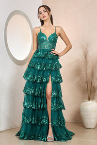 Adora Design 3218 Sequin Ruffle A-Line Slit Formal Prom Gown by Adora features shimmering sequin-embellished fabric with layered ruffles, crafted for flexibility and a flattering contour. The fit is easy to move in, thanks to the relaxed A-line shape and adjustable spaghetti straps. Available in sizes XS, S, M, L, XL, 2XL, 3XL.