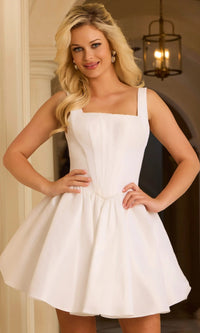 Precioso y muy favorecedor, este vestido corto de fiesta de corte A y escote cuadrado 45212 sin duda se convertirá en tu nuevo favorito para eventos semiformales. De Jovani, este adorable vestido corto de diseñador presenta un corpiño sin mangas estilo corsé con escote cuadrado que enmarca con gracia el escote y tirantes anchos que caen hasta la espalda cuadrada a juego. Este vestido de cóctel corto, entallado y con vuelo, tiene una falda corta de varias capas que se frunce en la cintura antes de extenderse desde las caderas hasta el bajo. Perfecto para bodas, fiestas de bienvenida y otras fiestas elegantes, este vestido corto de fiesta de corte A y escote cuadrado sin duda te hará ganar muchos cumplidos en tu gran noche.
