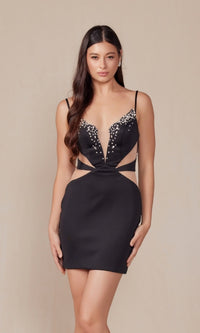 Luce este llamativo vestido corto de fiesta Q834 de Nox Anabel y siente su impresionante estilo. Con brillantes detalles de cuentas en su pronunciado escote en V, este vestido corto de fiesta presenta cortes geométricos transparentes en la cintura y una fina banda que rodea la espalda descubierta. Disponible en tallas grandes y para señoritas, este vestido de cóctel corto con espalda descubierta presenta un corte en forma de diamante que corona la minifalda ceñida que remata el diseño. Con un precio asequible de menos de $200 para fiestas de bienvenida, quinceañeras y otros eventos semiformales, este vestido corto estiliza la figura y resulta atractivo.