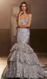 The gown features a mermaid silhouette with a cascading ruffle design.