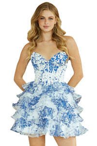 Vestido de fiesta corto Amelia Couture 2069S con escote en forma de corazón, volantes y corsé, sin tirantes, corte en A, para regreso a casa