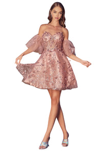 Detalles de la prenda: Apliques florales, varillas de corsé, corpiño transparente, mangas abullonadas, tiro medio transparente, dobladillo corto
