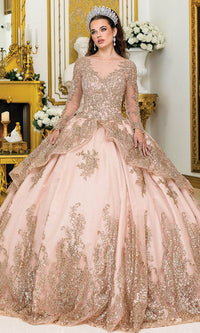 Command the spotlight in the majestic elegance of the Dancing Queen 1968 ballgown. This luxurious masterpiece features an illusion bateau neckline and long sheer sleeves adorned with glittering lace appliques that exude royal charm. The voluminous layered skirt flows into a grand cathedral train, creating a dramatic silhouette ideal for your most formal occasions. A lace-up closure at the back ensures a custom fit, while a cutout detail adds a modern twist. Perfect for quinceañeras, galas, or evening balls, this gown radiates timeless sophistication and glamour. Model is wearing Rose Gold color.
