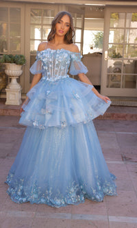 Luce una mágica declaración con el Nox Anabel H1360, un versátil vestido de fiesta dos en uno, perfecto para tu graduación, quinceañera o quinceañera. Este diseño con hombros descubiertos presenta mangas abullonadas transparentes, tirantes finos transparentes y un corpiño tipo corsé estructurado, adornado con un brillante estampado de remolinos de purpurina y delicados apliques de mariposas en 3D. La sobrefalda con volantes en capas añade dramatismo, revelando un dobladillo brillante hasta el suelo. Separa la falda para transformar el look en un vestido corto divertido y coqueto. Con espalda con cordones y encantadores detalles, este vestido ofrece un estilo inolvidable en ambos largos.