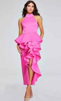 TL;DR? It features a high halter neckline, layered ruffle peplum, sleek satin fabric, and a captivating tea-length hem—all designed to make a bold, chic impression.