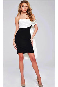 Prepárate para quedar cautivada con esta obra maestra Jovani 37392. Con un corpiño plisado y un diseño bicolor, el vestido irradia elegancia y elegancia atemporales. El escote recto con hombros descubiertos complementa el detalle semiabierto de la espalda. Además, la manga corta con lazo y drapeado le da un toque dramático. La falda crea una silueta entallada que se desliza sobre tus curvas y se extiende hasta el coqueto bajo corto. ¡Esta creación Jovani 37392 es un vestido imprescindible para tu noche especial! La modelo lleva el color blanco y negro. Detalles de la prenda: Manga corta, Corpiño plisado, Detalles de lazo, Espalda semiabierta, Entallado