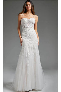 Vive una boda de ensueño con el encantador vestido de novia Jovani JB38490. Adornado con encaje bordado y lentejuelas sobre malla brillante, este vestido crea una silueta cautivadora con sus líneas entalladas. El corpiño presenta delicados tirantes finos, un romántico escote corazón y un favorecedor corsé. La cintura ajustada realza la figura, mientras que la espalda de tiro medio, el cierre de cremallera oculta y los detalles de botones añaden un toque de elegancia. La silueta trompeta de la falda cae con gracia en una cola de corte, aportando un toque majestuoso a tu look de novia. Haz realidad la boda de tus sueños con la belleza atemporal del vestido de novia Jovani JB38490. La modelo lleva el color Off-White. Detalles de la prenda: Tirantes finos, Cuentas, Detalles bordados, Espalda transparente de tiro medio, Cierre de cremallera oculta, Botones, Cola de corte