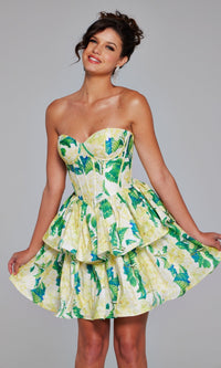 Un suave estampado floral hace que este vestido de fiesta corto sin tirantes JVN3757 sea tan dulce como elegante. De JVN by Jovani, este vestido de fiesta corto sin tirantes con volantes luce un estampado colorido desde el escote corazón hasta el bajo, ideal para fiestas de bienvenida, bodas y otros eventos semiformales. Este vestido de cóctel corto sin tirantes con estampado tiene un corpiño estilo corsé que rodea la cintura para un look ajustado, mientras que la falda corta en forma de A fluye hasta el bajo con volantes para completar el diseño. Un estilo cautivador que sin duda se convertirá en uno de tus favoritos, este vestido de fiesta corto sin tirantes está listo para selfies en la gran noche.