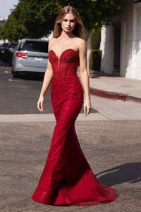 Looking for a striking gown that combines elegance with intricate detailing? The Ladivine CC8885 strapless sweetheart dress offers just that. Designed by Cinderella Divine, this long, fitted gown is crafted from lightweight tulle with dazzling rhinestones that catch the light with every movement. The deep red shade makes a bold statement—ideal for prom, black-tie events, or any occasion demanding sophistication.