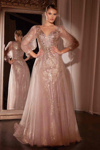 The Ladivine CD0102 dress from Cinderella Divine is a stunning long sleeve gown that combines classic elegance with modern detailing. Crafted from layered glittering tulle, it features a graceful A-line silhouette that moves effortlessly with you. The deep V-neckline adds a touch of allure, while the three-quarter bishop sleeves enhance its sophisticated charm.