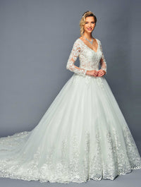 Vestidos de Novia Modestos | El Vestido de Novia de 476 es elegante y atemporal, con una majestuosa silueta de vestido de gala en forma de A, un favorecedor escote en V y mangas largas y ajustadas. El corpiño estructurado realza tu figura natural, mientras que la falda larga se mueve con gracia. Perfecto para bodas en la iglesia, en invierno o formales, este vestido ofrece una hermosa combinación de modestia y el encanto clásico de una novia.